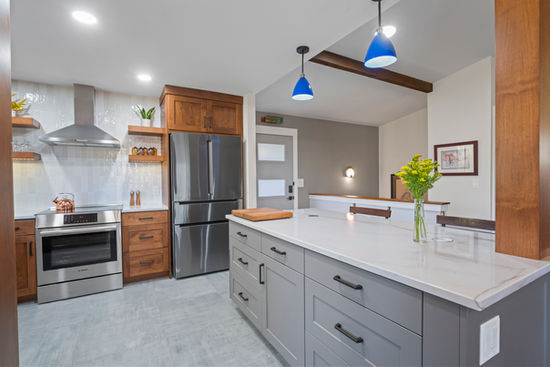 The Adriel Home project included a new open-concept kitchen, master bath restructure, hard-wood flooring throughout the main level, and several other structural and finish changes. In the kitchen, we removed two walls that closed off the living space from the kitchen, then improved the cabinetry function and layout with custom cabinetry. The counter to ceiling backsplash provided a touch of luxury. The master bath included a complete layout and wall restructure with an adjoining closet and laundry room. We were able to increase the footprint of the master bath, while also adding a larger walk-in closet. Final touches on this project included new trim and doors, rustic hardwood flooring, new paint, and new wood finishes.