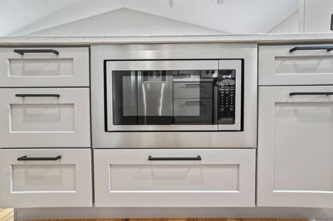 This remodel is a great example of how to give your space a whole new look without having to move any walls! Integrating the microwave into the island and adding a tall pantry cabinet cleared up counter space while increasing functionality. New modern lighting paired with beautiful new tile brightened up the space. This simple yet effective kitchen refresh turned out great!